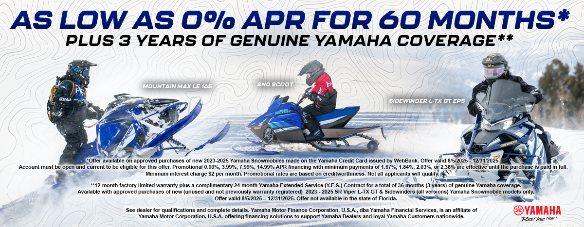 *Offer available on approved purchases of new 2023-2025 Yamaha Snowmobiles made on the Yamaha Credit Card issued by WebBank. Offer valid 8/5/2025 - 12/31/2025. Account must be open and current to be eligible for this offer. Promotional 0.00%, 3.99%, 7.99%, 14.99% APR financing with minimum payments of 1.67%, 1.84%, 2.03%, or 2.38% are effective until the purchase is paid in full. Minimum interest charge $2 per month. Promotional rates are based on creditworthiness. Not all applicants will qualify.